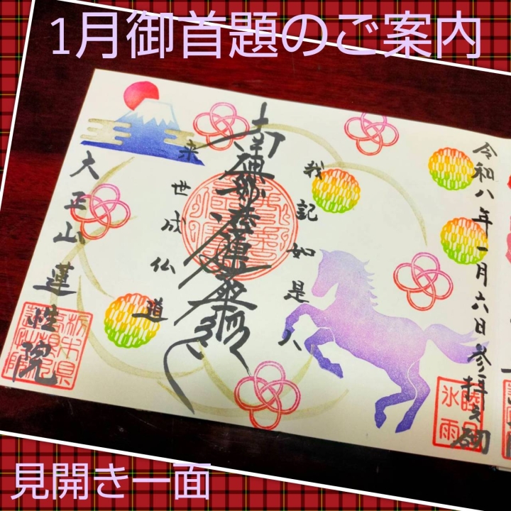 見開きサイズの御首題には季節の花などをあしらい、月替わりで更新しています。